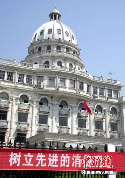 2014年4月7日,江蘇省淮安市漣水縣環(huán)境保護(hù)局辦公樓外觀“霸氣”,猶如山寨版的美國(guó)白宮大樓,建筑風(fēng)格與周圍其他政府單位辦公樓迥異。在這座辦公樓墻外,懸掛著“激發(fā)正能量”、“樹(shù)立先進(jìn)的消費(fèi)觀念”等橫幅標(biāo)語(yǔ)。中新社發(fā) 安東 攝 圖片來(lái)源:CNSPHOTO