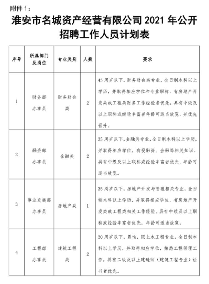 4.具體崗位要求詳見附件1《淮安市名城資產(chǎn)經(jīng)營有限公司2021年公開招聘工作人員計劃表》;